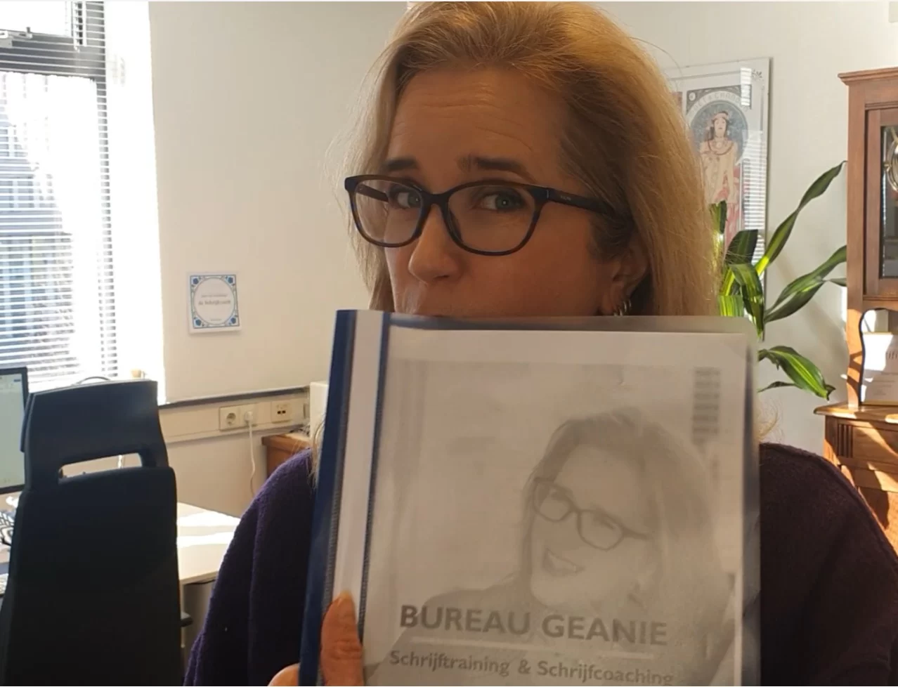 Zelfstandige schrijfcoach. Een jaar lang doe ik intern bij het ministerie van VWS ervaring op als schrijfcoach en -trainer. En dan, eind 2024, neem ik afscheid en ga ik volledig als zelfstandig ondernemer verder. Op de foto zie je mij met mijn ondernemingsplan. Sindsdien geef ik schrijftrainingen en schrijfcoaching aan twee uiteenlopende doelgroepen: ambtenaren en creatief schrijvers. Maar voor mij zijn die doelgroepen niet zo uiteenlopend: ik verenig ze in mezelf!